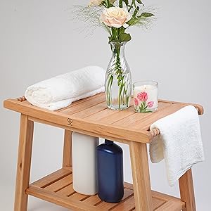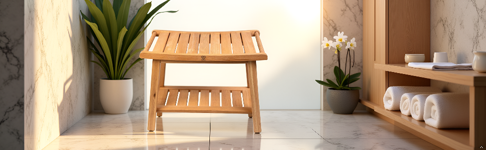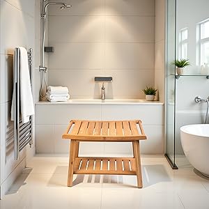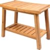 24″ Shower Bench with Shelf & Handles, Solid American Red Oak Wooden Shower Bench Seat for Inside Shower, Non-Slip Bathroom Bench with Adjustable Legs, 300 lbs Capacity