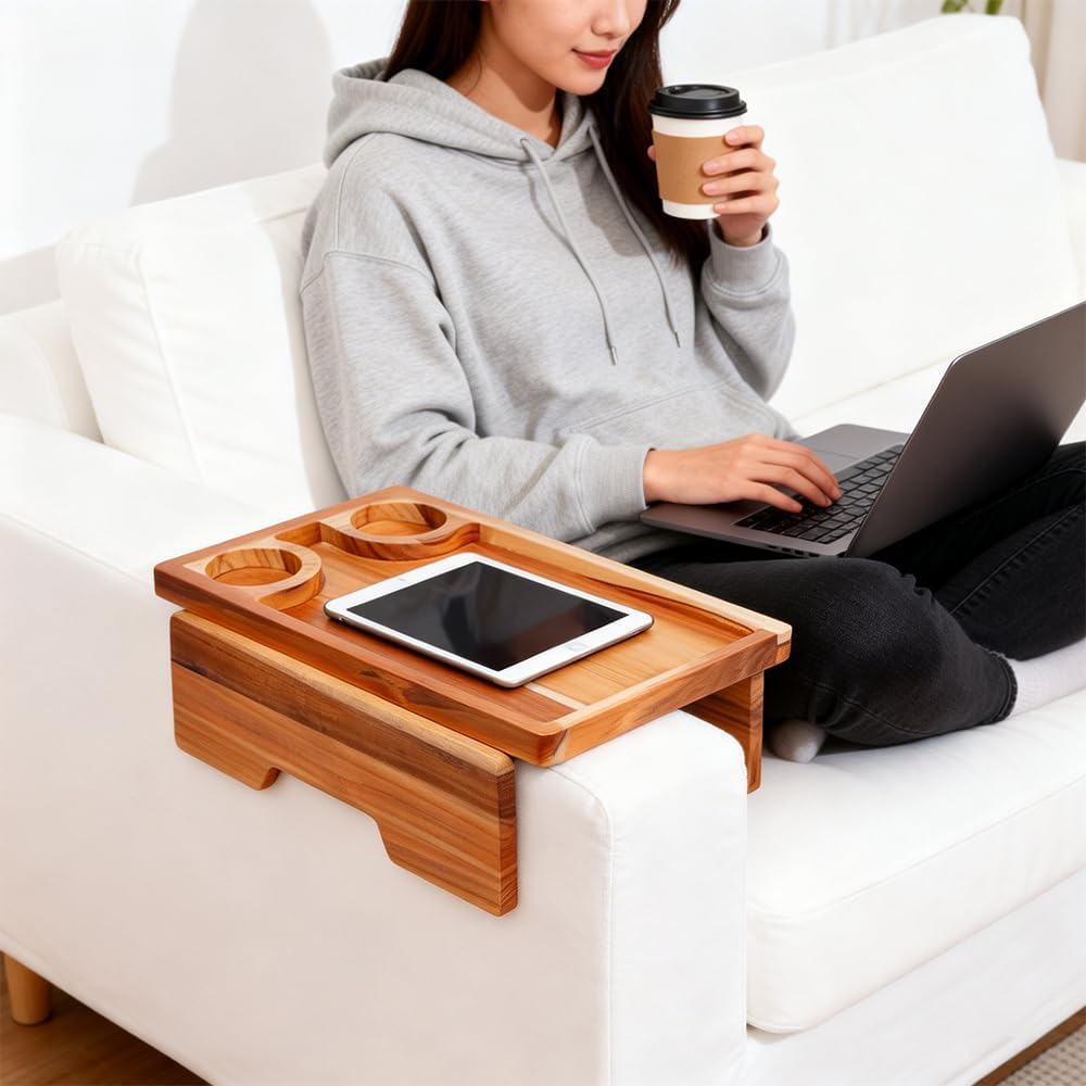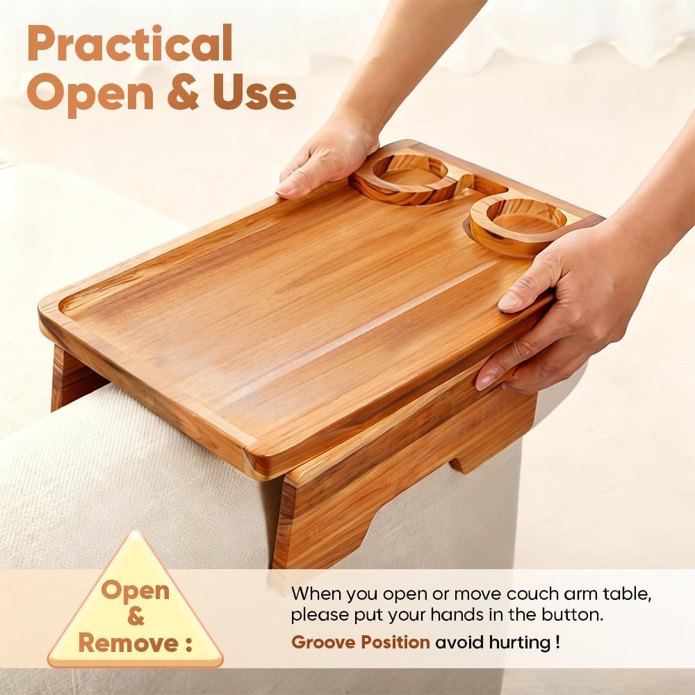 - BUILT-IN DUAL CUP HOLDERS – SPILL PREVENTION DESIGN: Features 2 recessed cup holders that securely hold mugs, cups, or tumblers in place. The sunken design helps prevent tipping and spills, making this a reliable couch cup holder tray and arm rest table for couch use during meals or drinks.